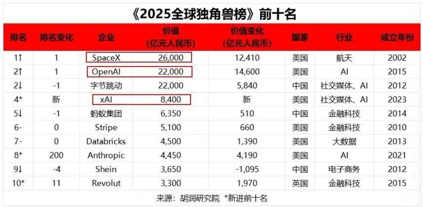 在胡润研究院发布的《2025全球独角兽榜》中,马斯克旗下的多家未上市企业跻身其中,且包揽了前五的3个席位,其中xAI是全球十大独角兽企业中最年轻的,当时的价值已飙至8400亿元。