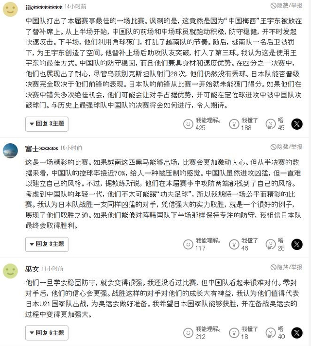 第二个,日本球迷对中国足球的进步也是相当惊讶了。他们说:非常期待与史上最强的中国队进行的决赛。中国队防守稳固,个子高、身材强壮、速度快,还非常有耐心,最可怕的是他们的反击和定位球,日本国内近年来完全低估了这个对手。中国队一旦学会稳固防守,就会变得很强,而且年轻一代已经不喜欢功夫足球了。还有球迷感慨:我看了中国对越南,就防守而言,简直就像看一支完整的日本国家队,如果中国队保持这种信心,未来会成为一支非常强大的对手。